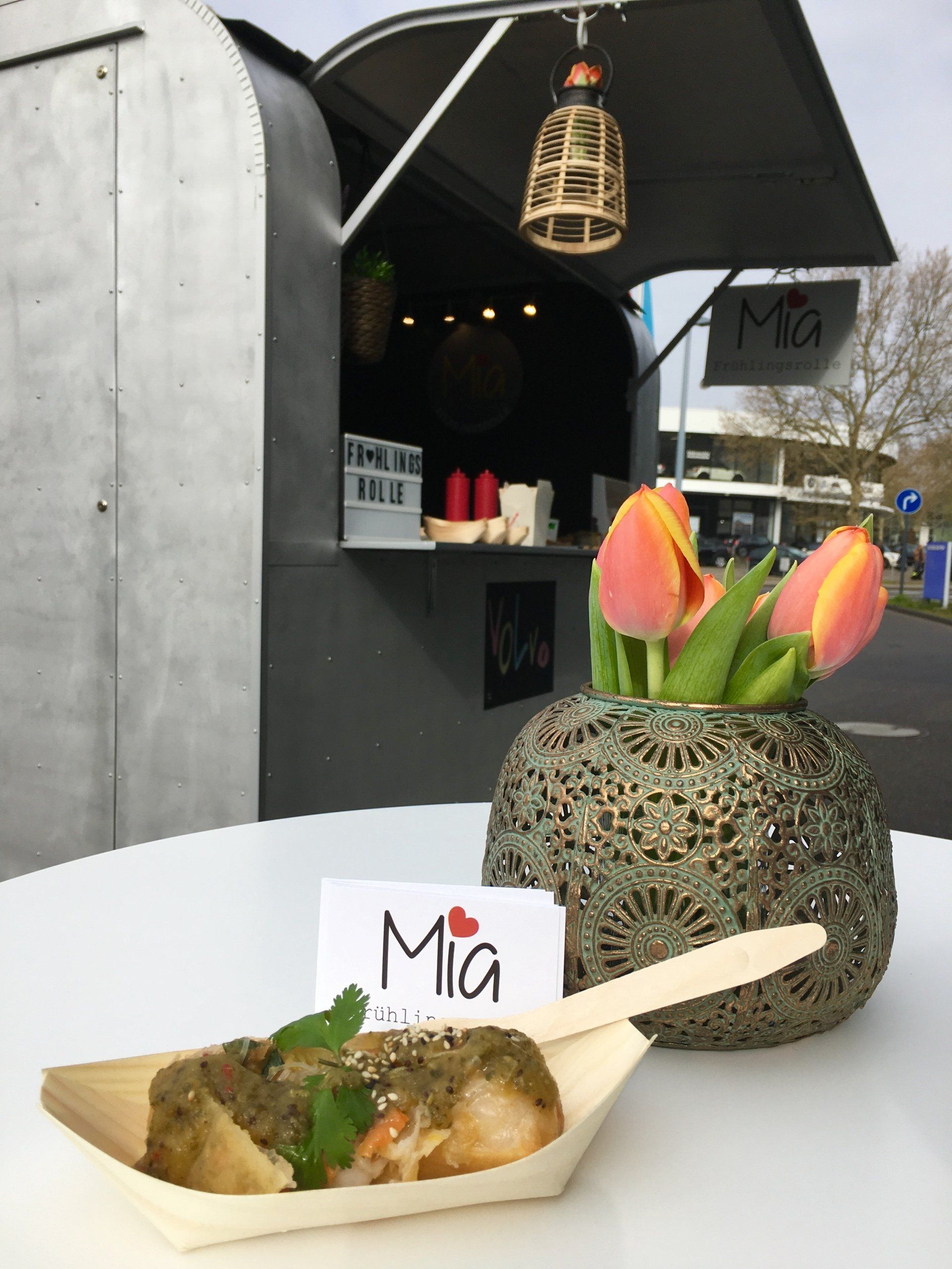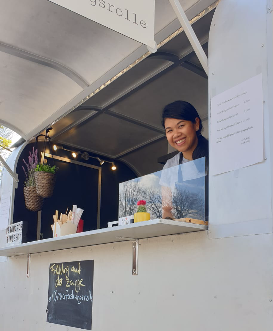 Wir sind Celine und Dimitrios, zusammen haben wir uns einen kleinen Food Trailer Mia Frühlingsrollen, der nach unserer gemeinsamen Tochter Mia genannt ist zugelegt.